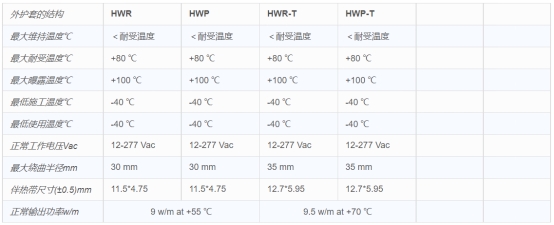 這款伴熱帶主要用于民用場合的水管防凍和維持溫度,其持續(xù)耐受溫度為80℃,短時極限暴露溫度為100℃,這款電伴熱帶為自限式電伴熱帶,其發(fā)熱量隨溫度的升高而降低,即使不采用溫控系統(tǒng),仍能保證一定的安全性。